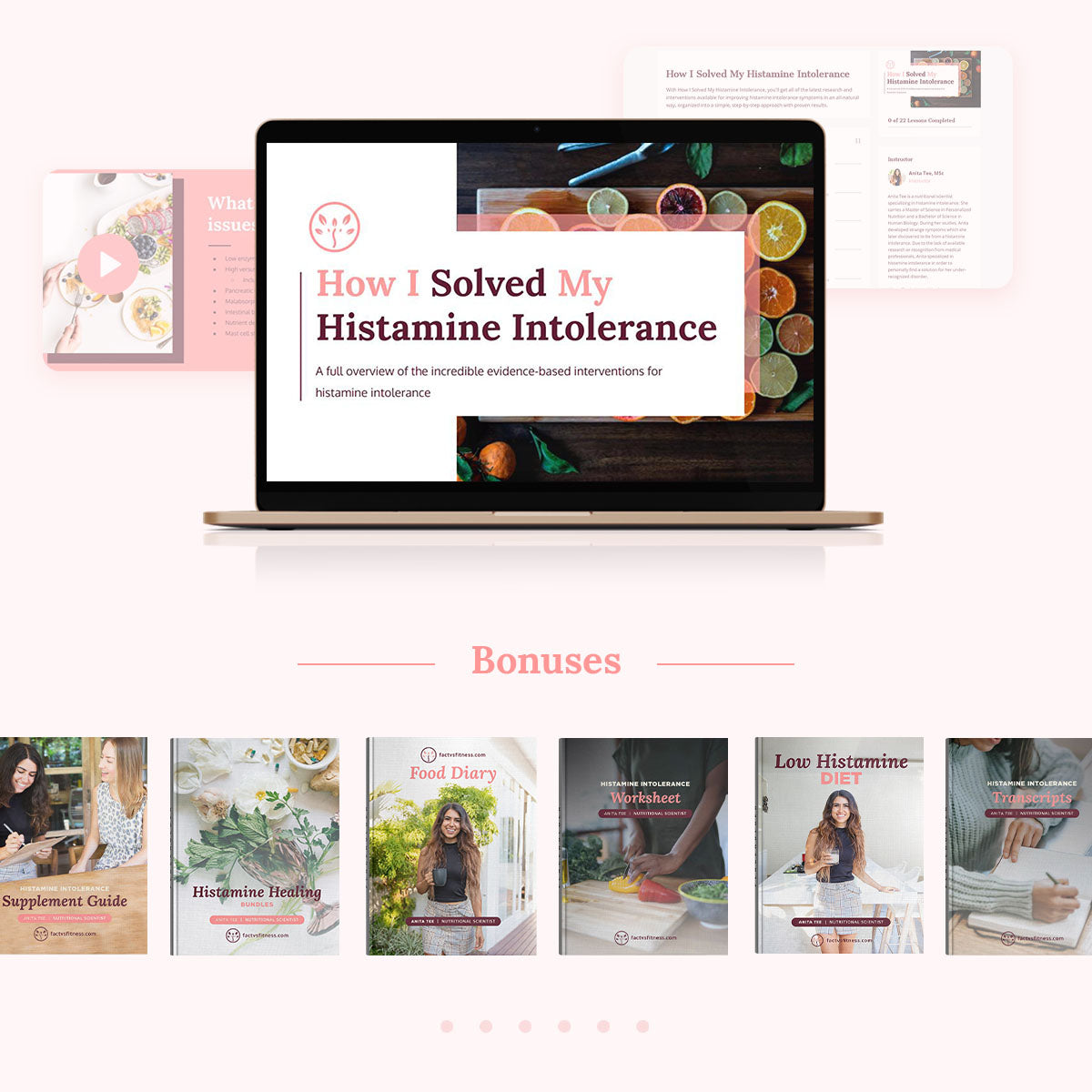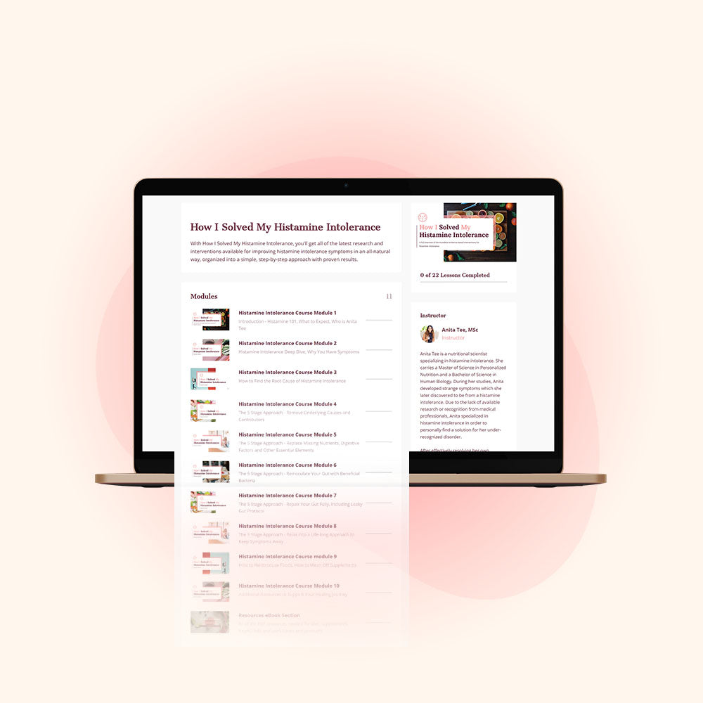 This unique, 5-stage protocol will show you the step-by-step approach I used to resolve histamine intolerance, for good. In a 10 module, self-paced video course, you’ll discover exactly how to improve and eliminate your histamine symptoms including skin rashes, anxiety, digestive symptoms, inflammation and more. By the end of this course, you’ll be able to eat worry-free, with little to no restrictions or symptoms.