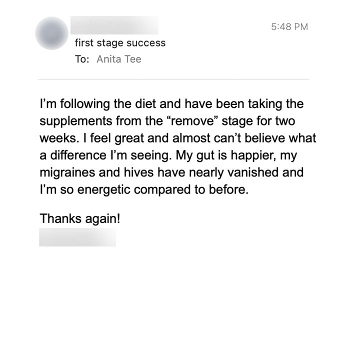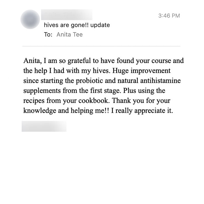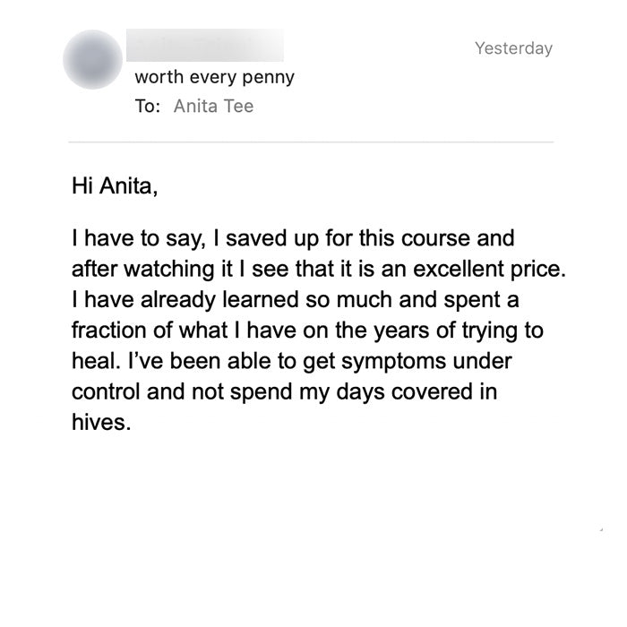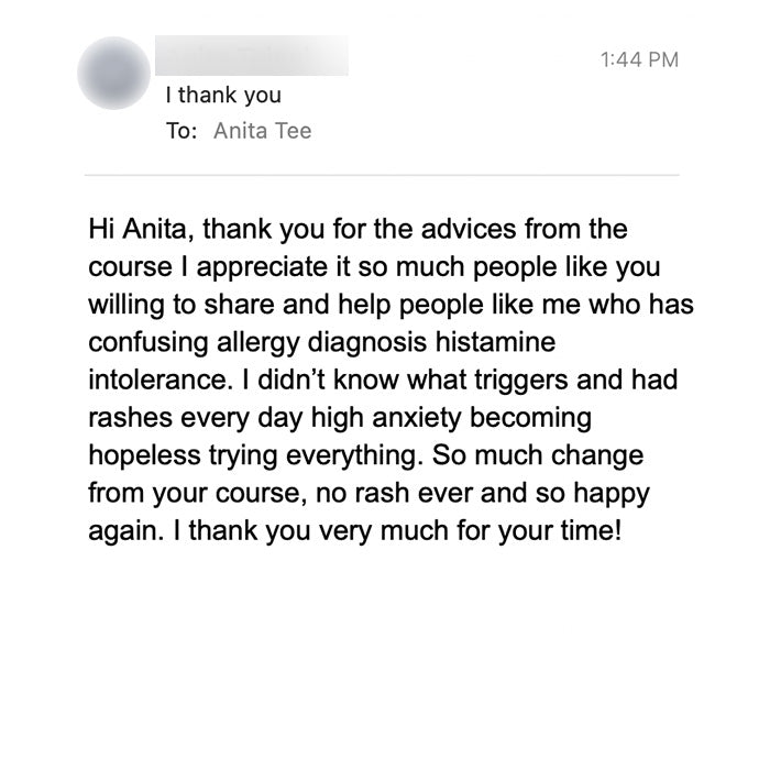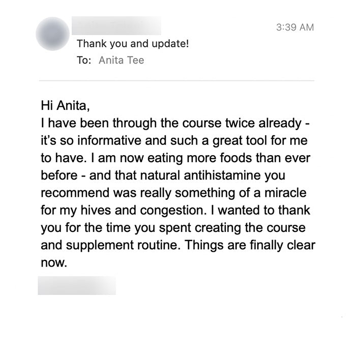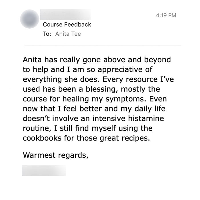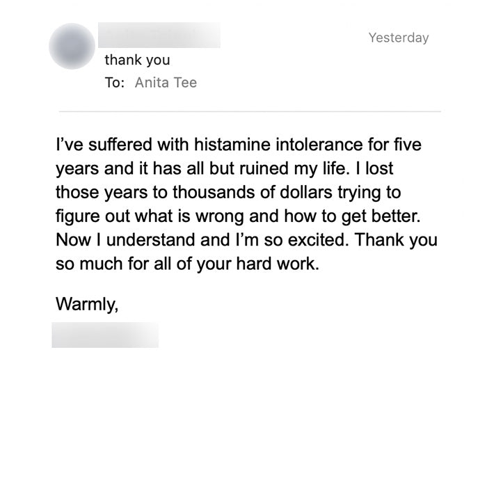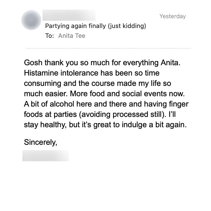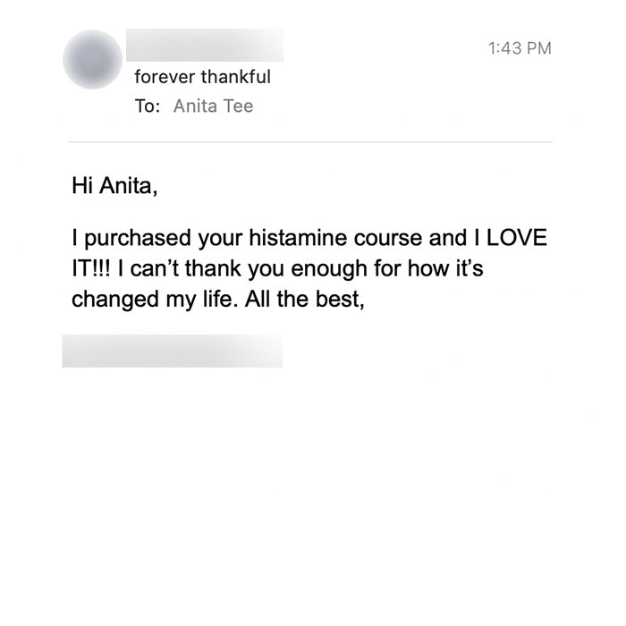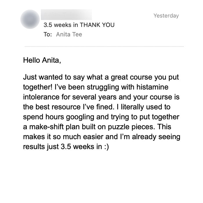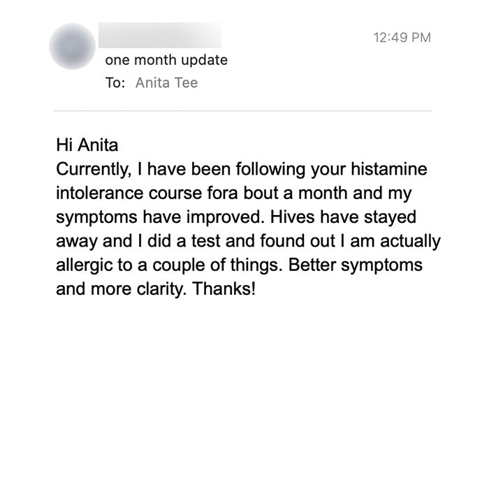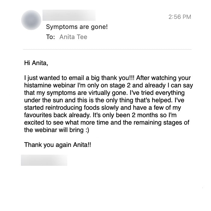 l just wanted to email a big thank you!!! After watching your histamine webinar I'm only on stage 2 and already I can say that my symptoms are virtually gone. I've tried everything under the sun and this is the only thing that's helped. I've started reintroducing foods slowly and have a few of my favourites back already. It's only been 2 months so I'm excited to see what more time and the remaining stages of the webinar will bring :)