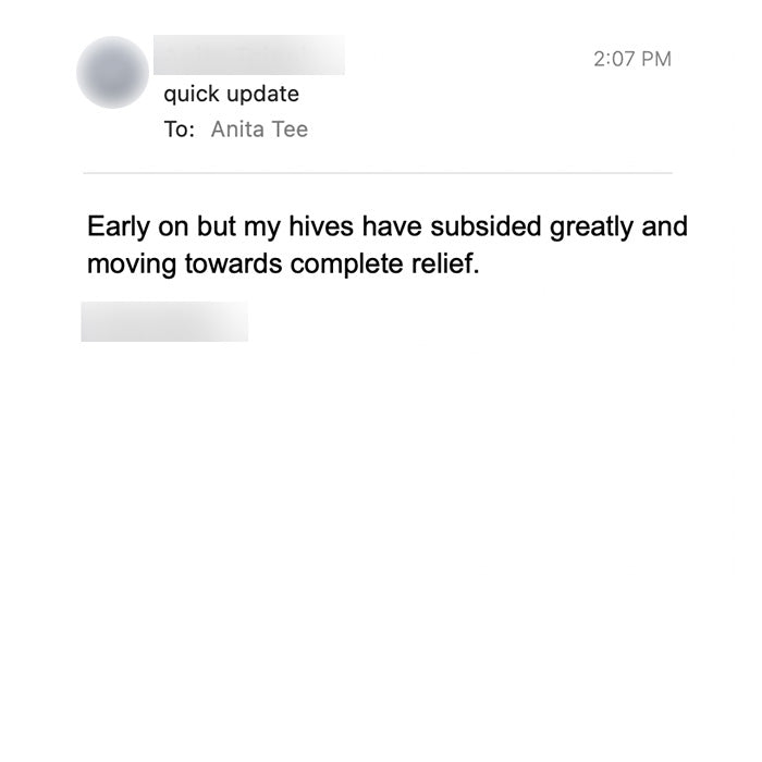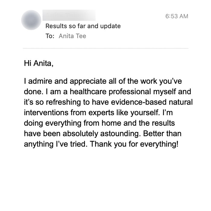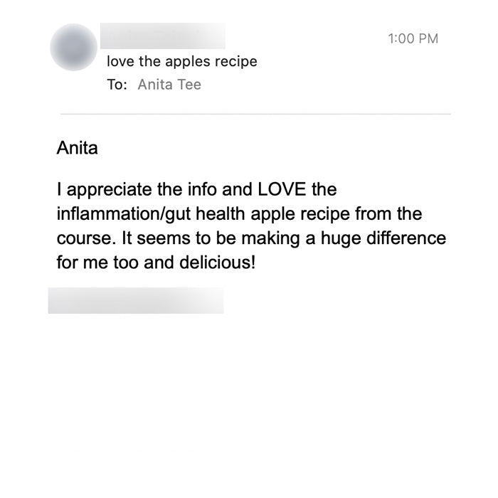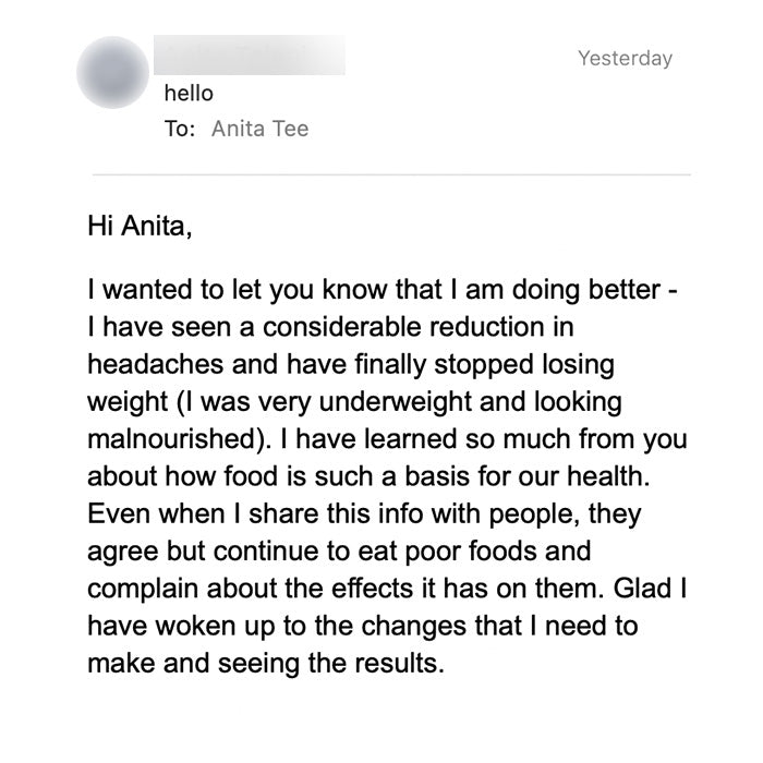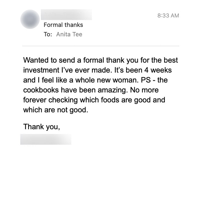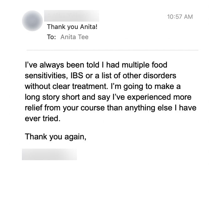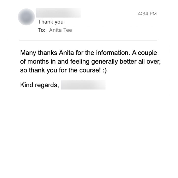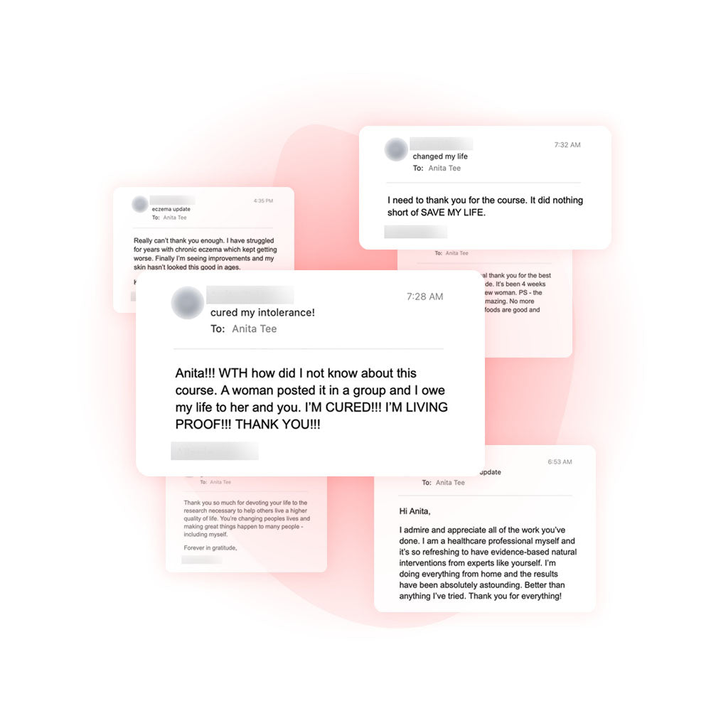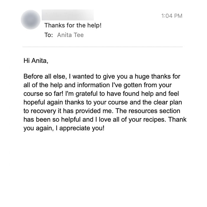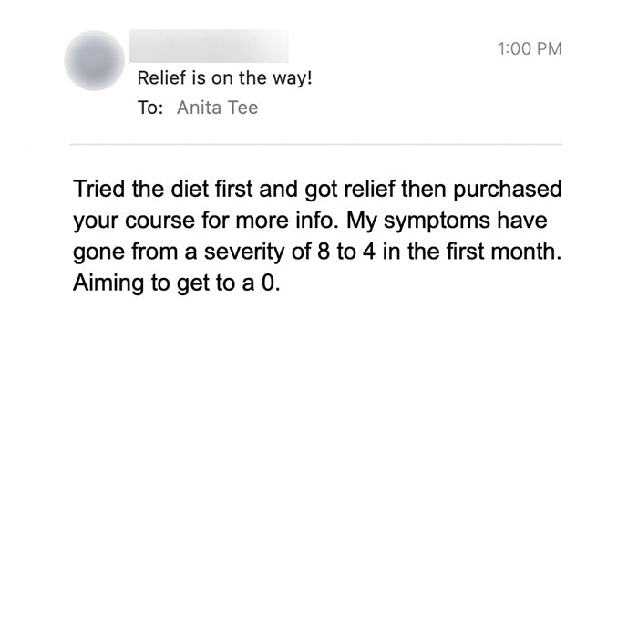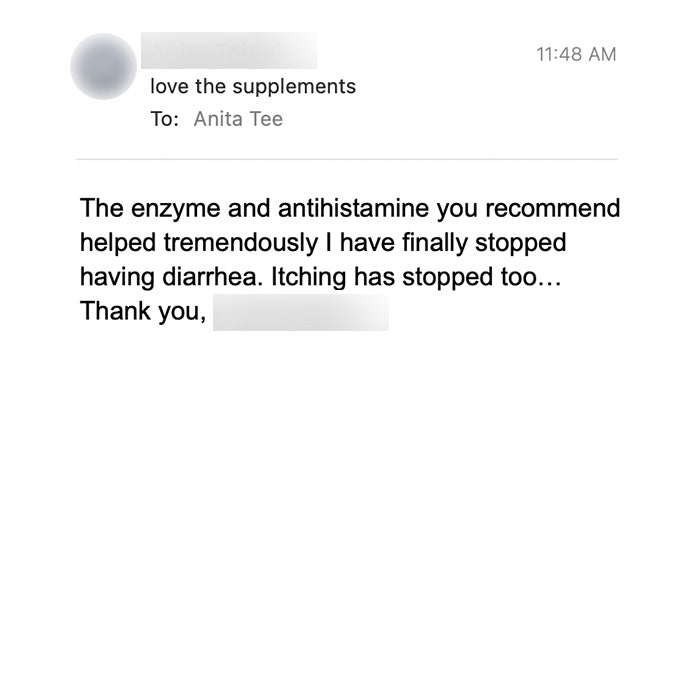 l just wanted to email a big thank you!!! After watching your histamine webinar I'm only on stage 2 and already I can say that my symptoms are virtually gone. I've tried everything under the sun and this is the only thing that's helped. I've started reintroducing foods slowly and have a few of my favourites back already. It's only been 2 months so I'm excited to see what more time and the remaining stages of the webinar will bring :)