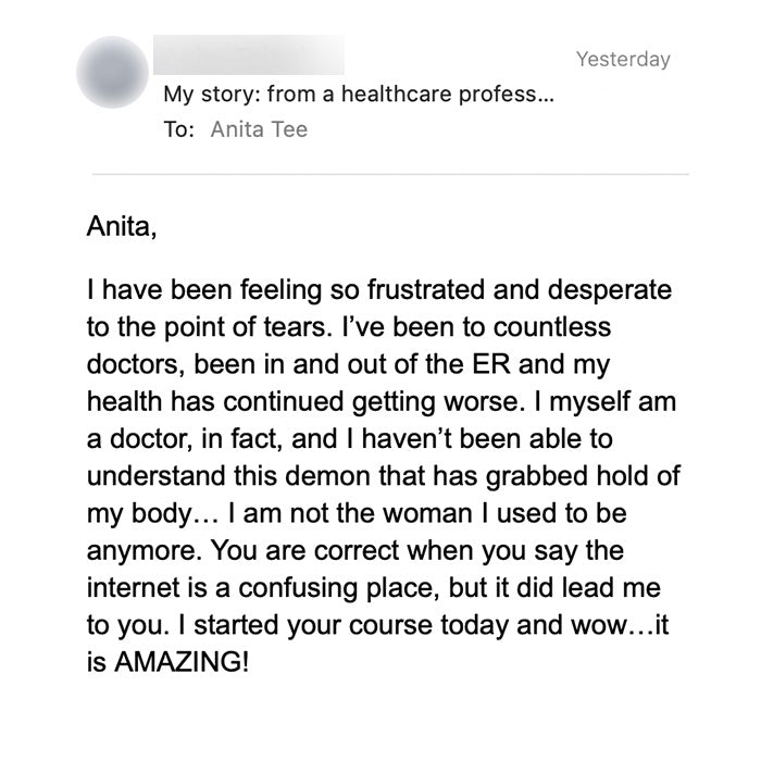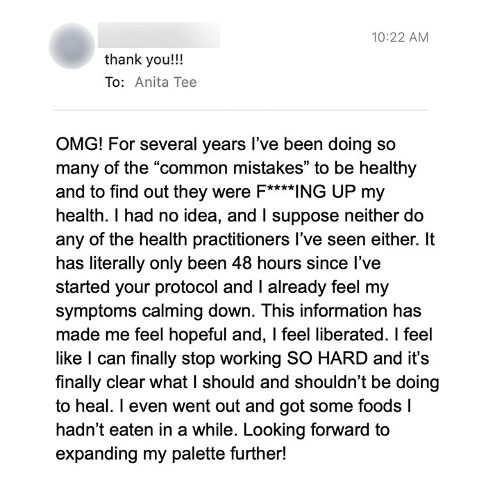 OMG! For several years I've been doing so many of the ""common mistakes"" to be healthy and to find out they were F**""ING UP my health. I had no idea, and I suppose neither do any of the health practitioners I've seen either. It has literally only been 48 hours since I've started your protocol and I already feel my symptoms calming down. This information has made me feel hopeful and I feel liberated. I feel like I can finally stop working SO HARD and iť's finally clear what I should and shouldn't be doing