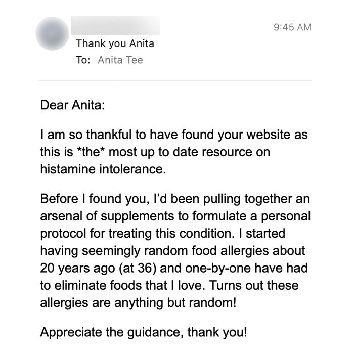 histamine intolerance.Before I found you, I’d been pulling together an arsenal of supplements to formulate a personal protocol for treating this condition. I started